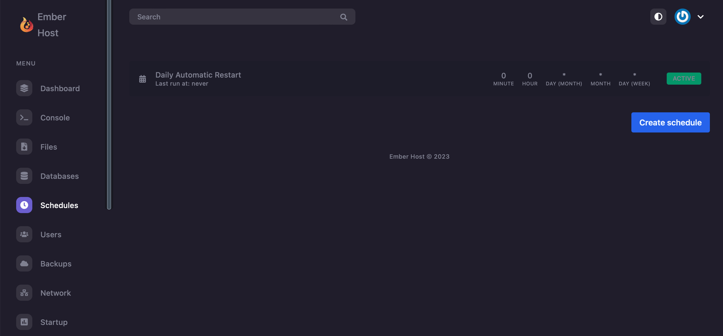 Head over to the Ember Host panel and click on schedules on the sidebar. The page you see should show you a list of all existing schedules that will run.